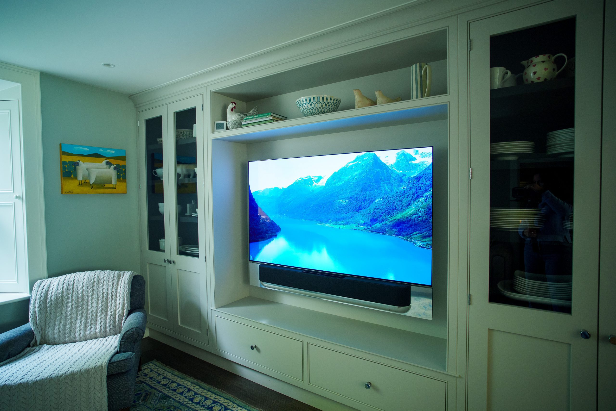 A BeoVision Theatre 65” is recessed into the cabinetry beside the kitchen — perfect for finishing a meal and relaxing to watch TV. - Main Living Room with Bar