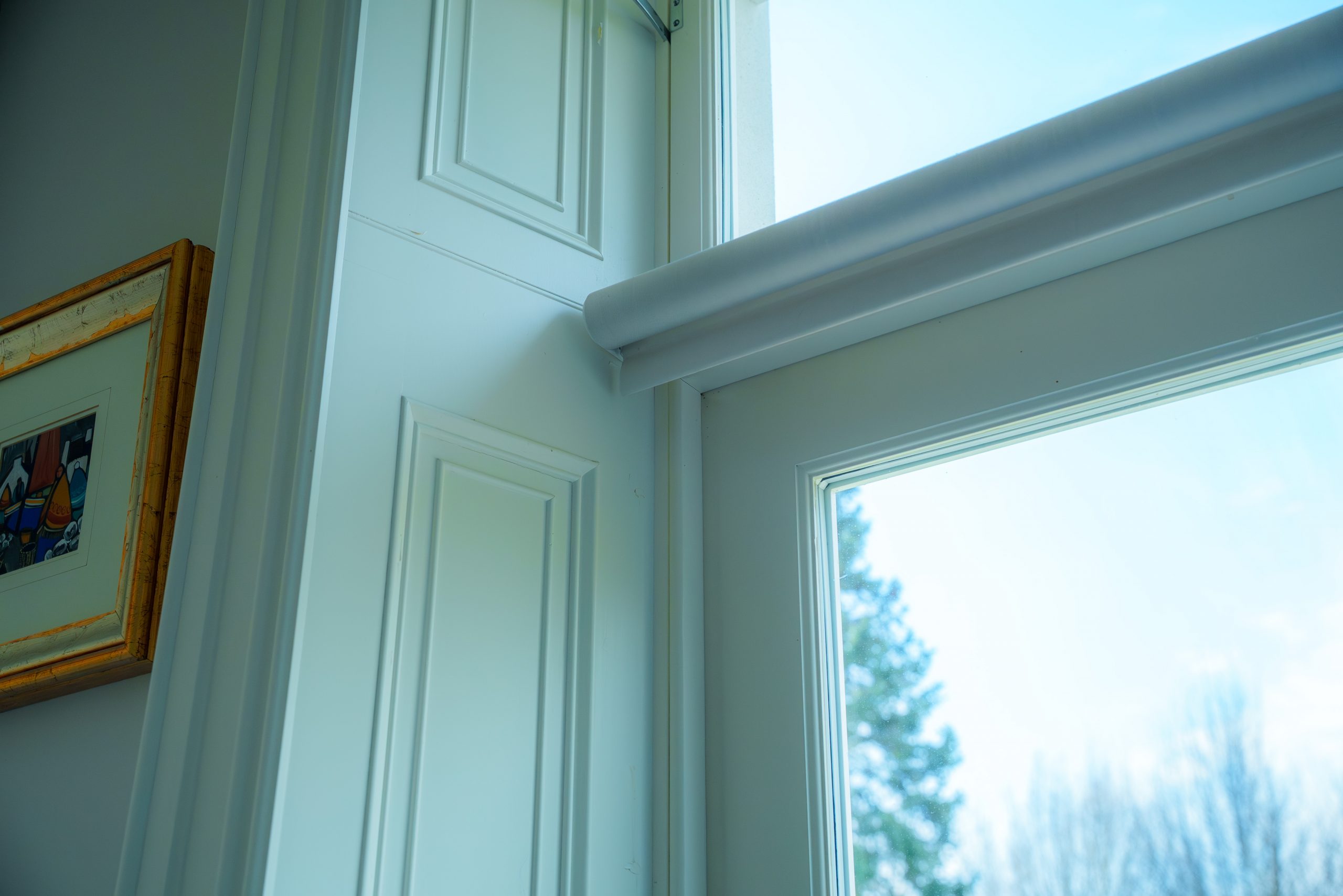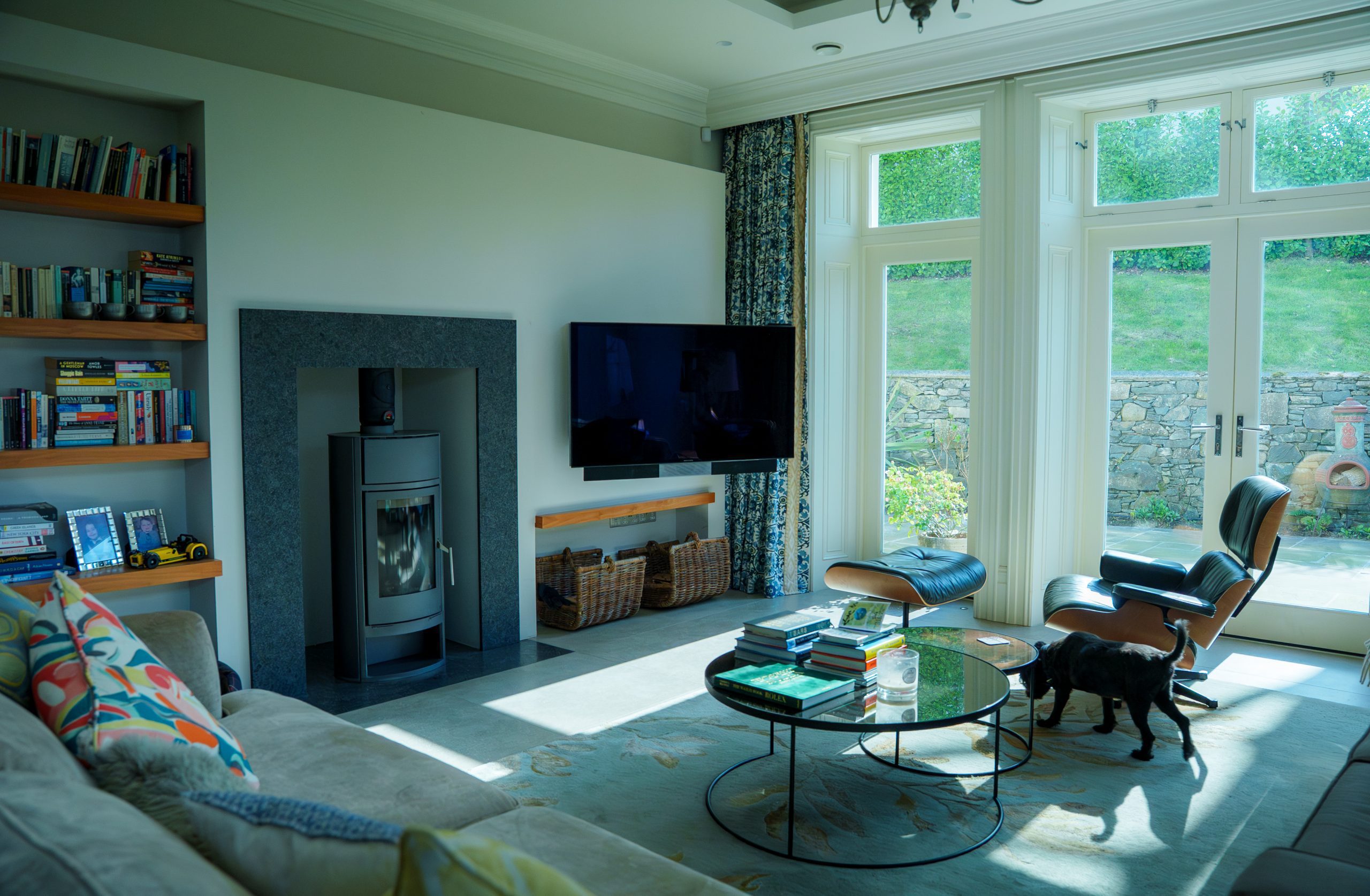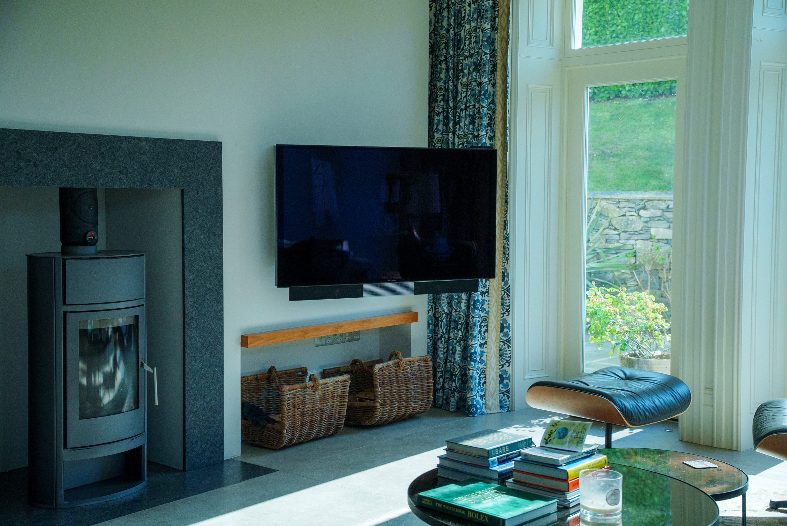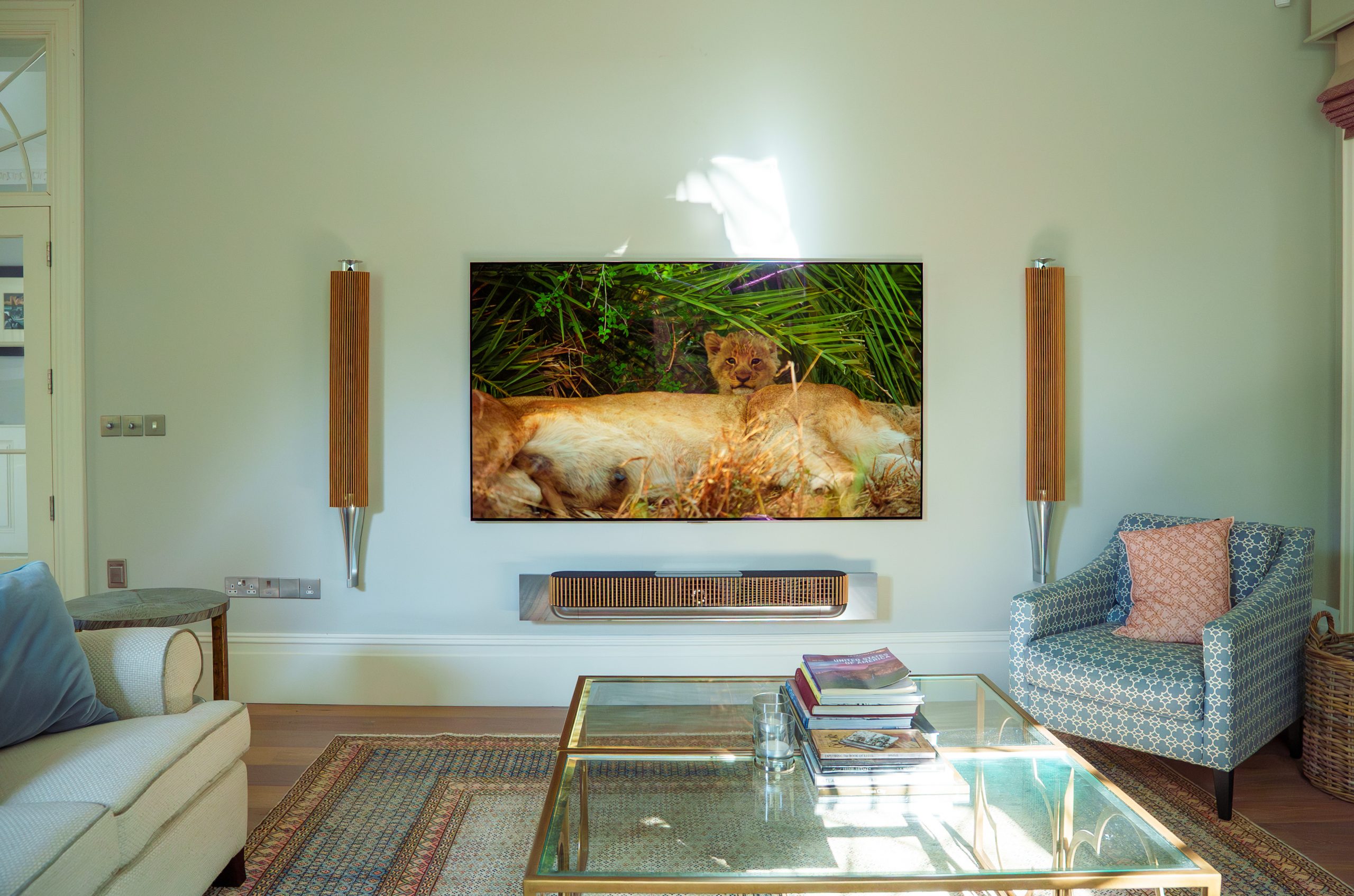 The kitchen retains a BeoVision Avant, still striking in both form and function. Mounted on a motorised wall bracket, it elegantly pivots out when activated, facing the room for optimal viewing. - Lighting & Blind Integration