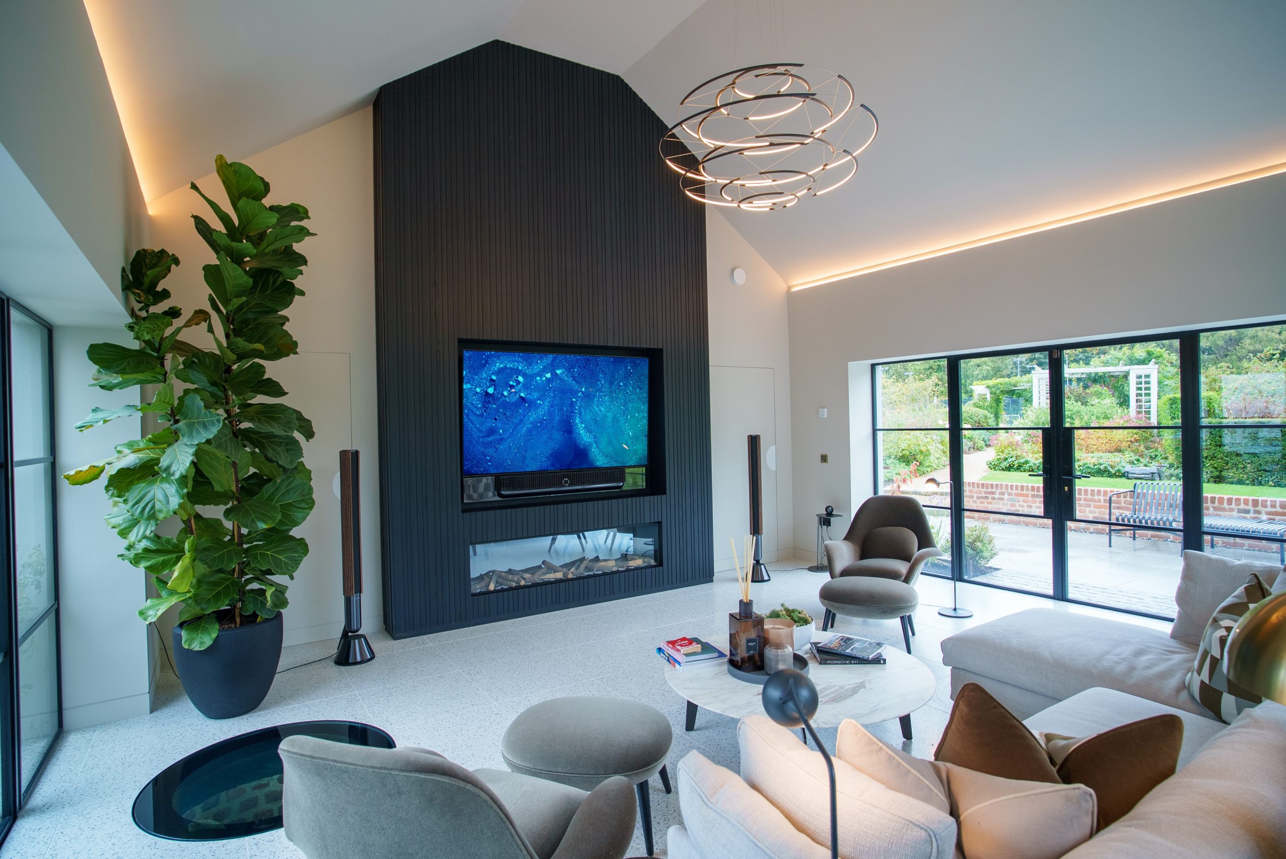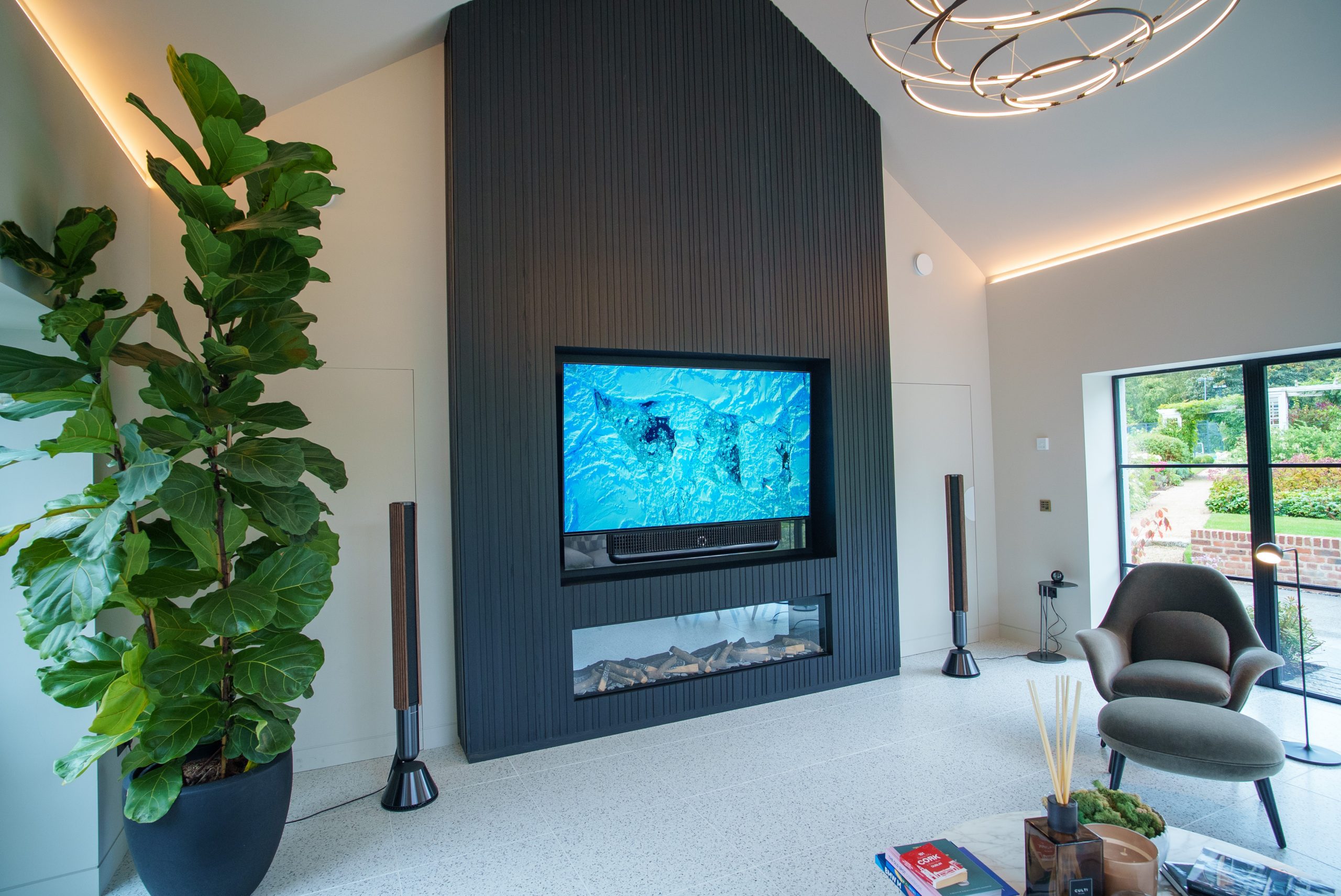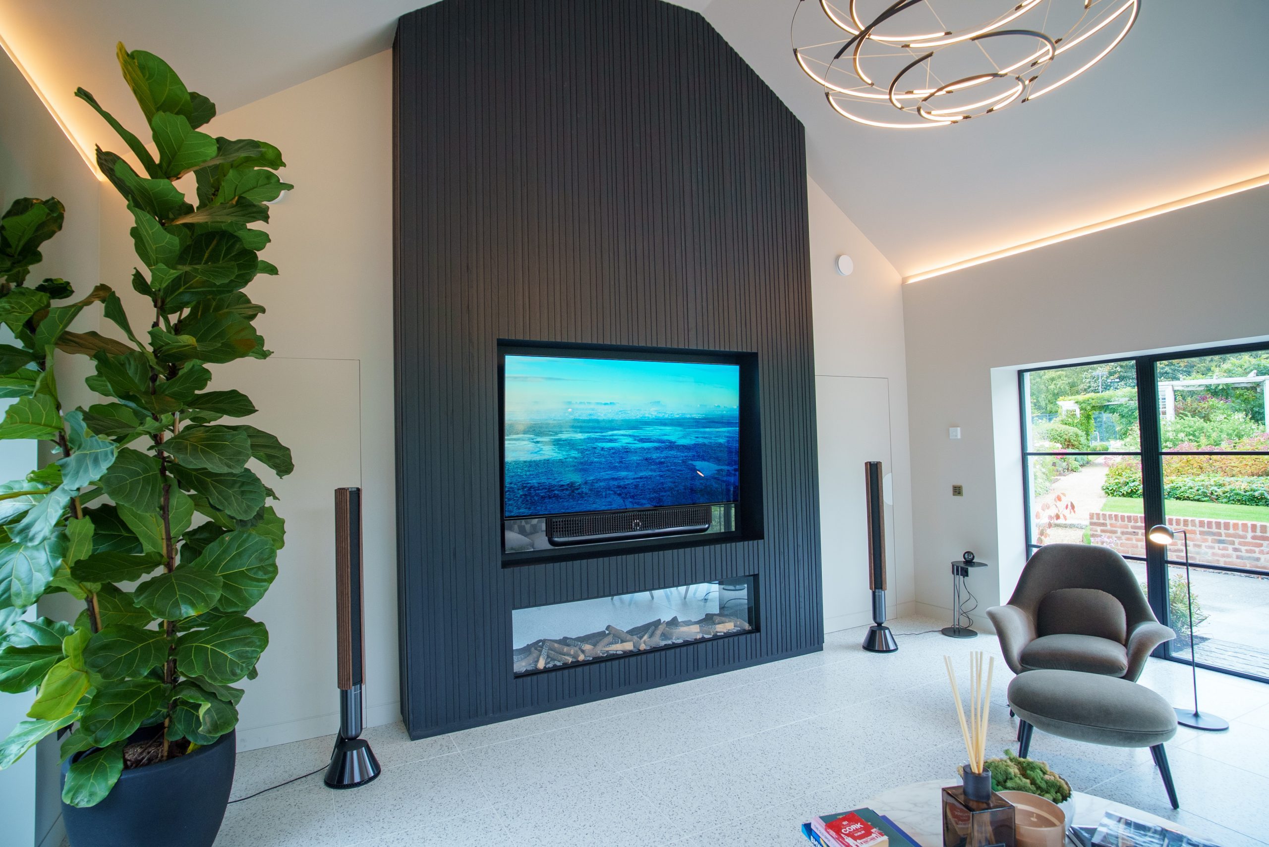 - BeoVision Theatre 77” TV recessed into a bespoke media wall.