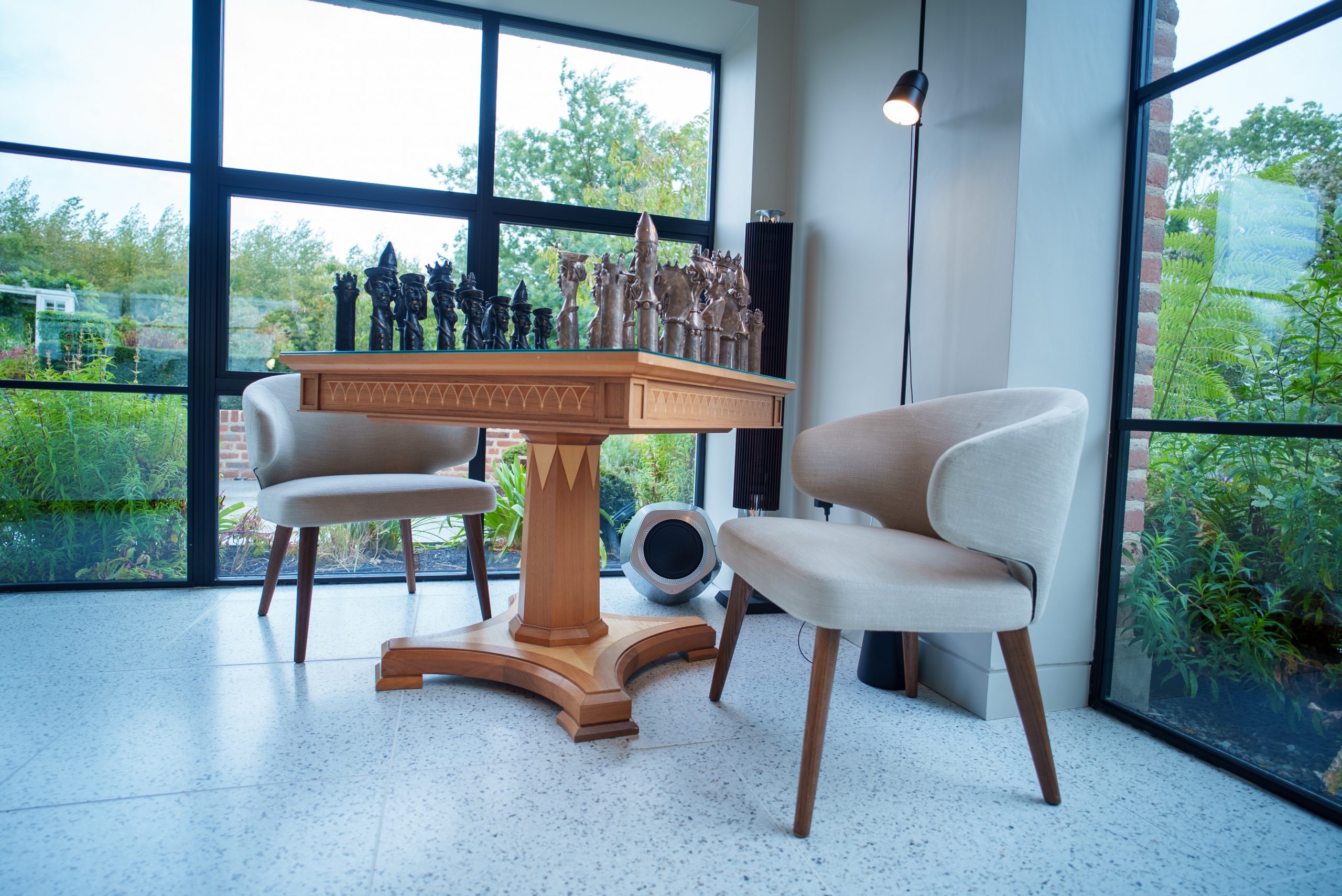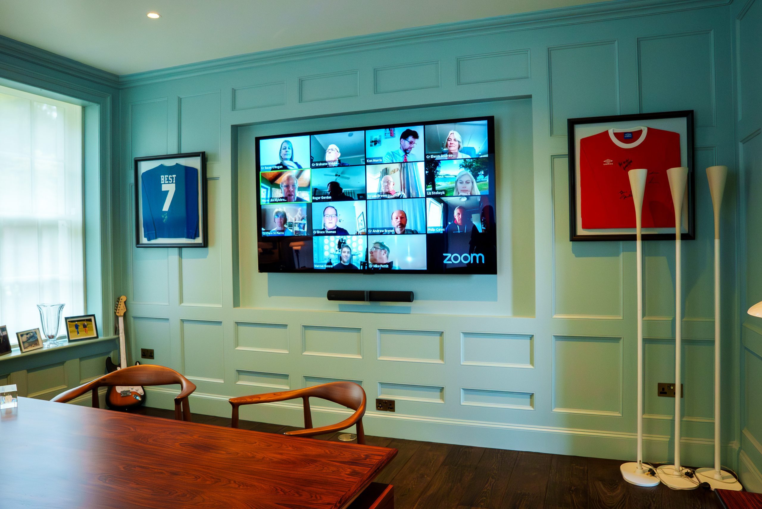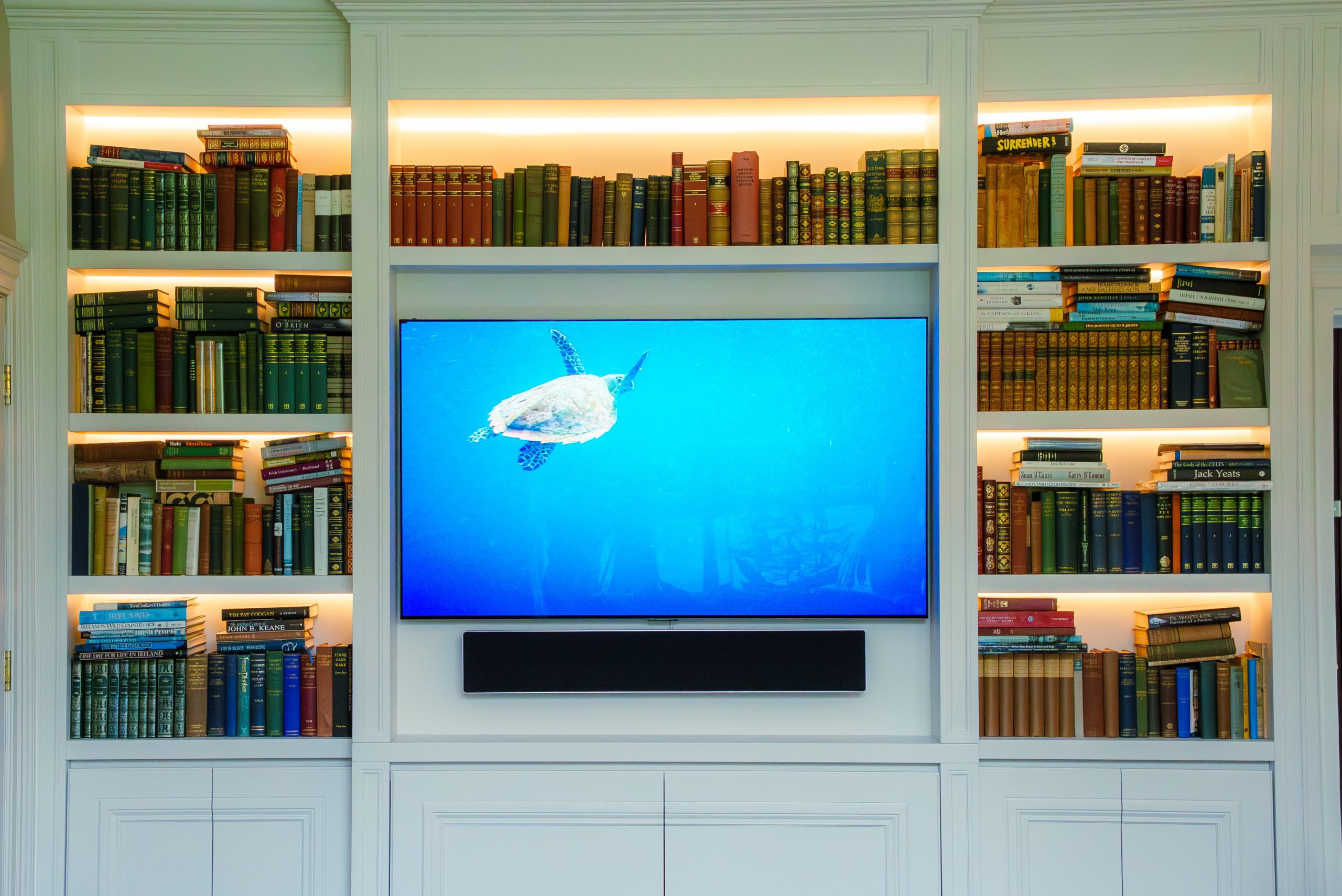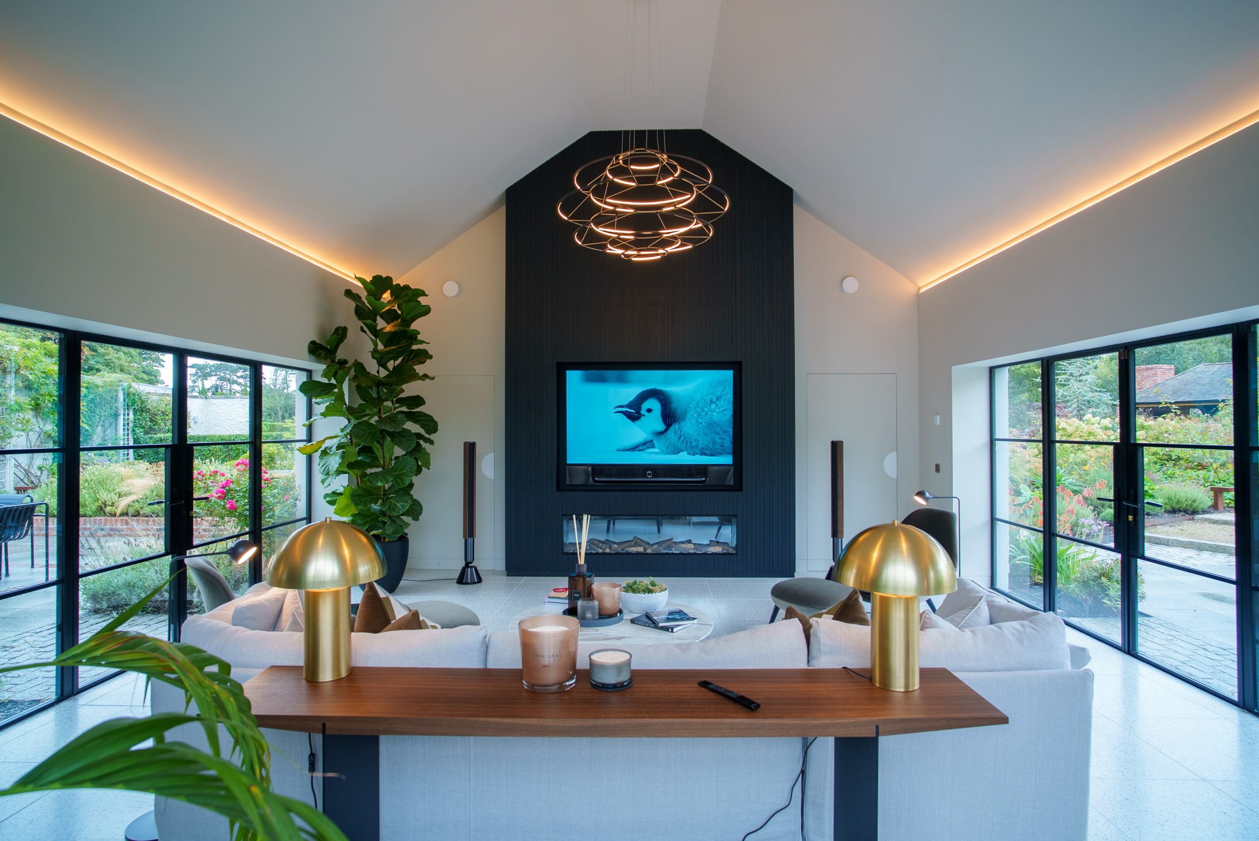 - BeoVision Theatre 77” TV recessed into a bespoke media wall.