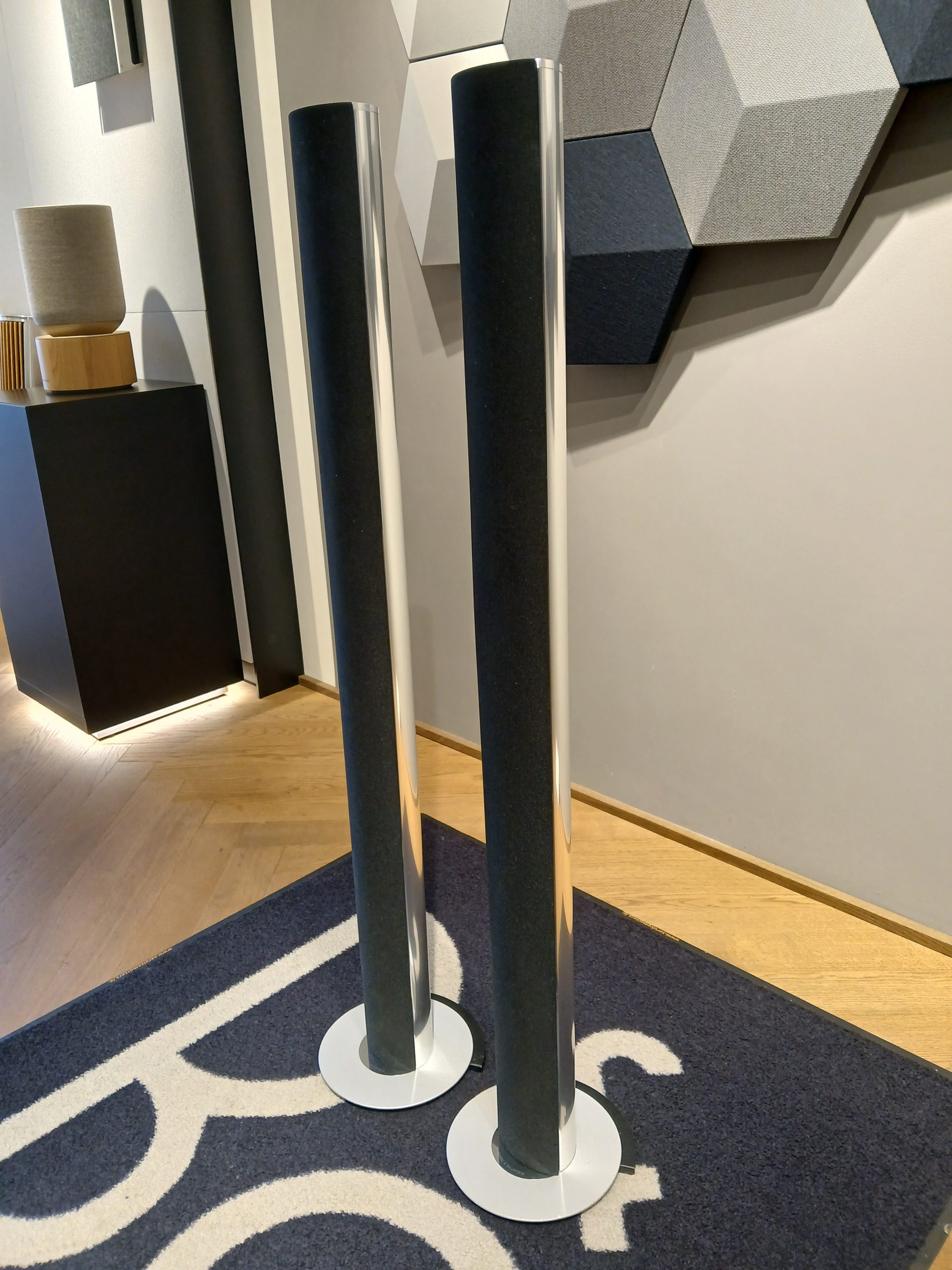 Bang & Olufsens famous BeoLab 6000 speakers, delivering amazing sound in two slim standing aluminium columns.